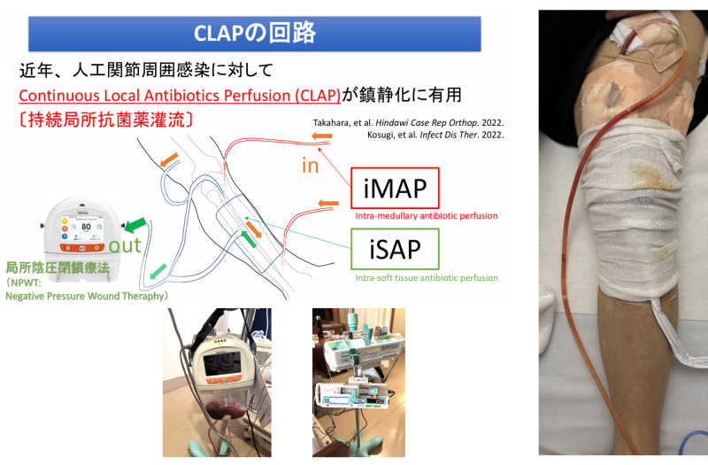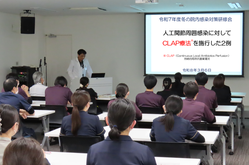 人工関節周囲感染に対してCLAP療法を行った2例(人工股関節1例と人工膝関節1例)の経過報告を行いました。人工関節を抜去してから二期的再置換が必要だった従来の治療に比べると、CLAPは時間的にも精神的にも、また患者様だけでなく医療側の負担もかなり軽減した画期的な治療であり、その治療法について全職員で復習しました。